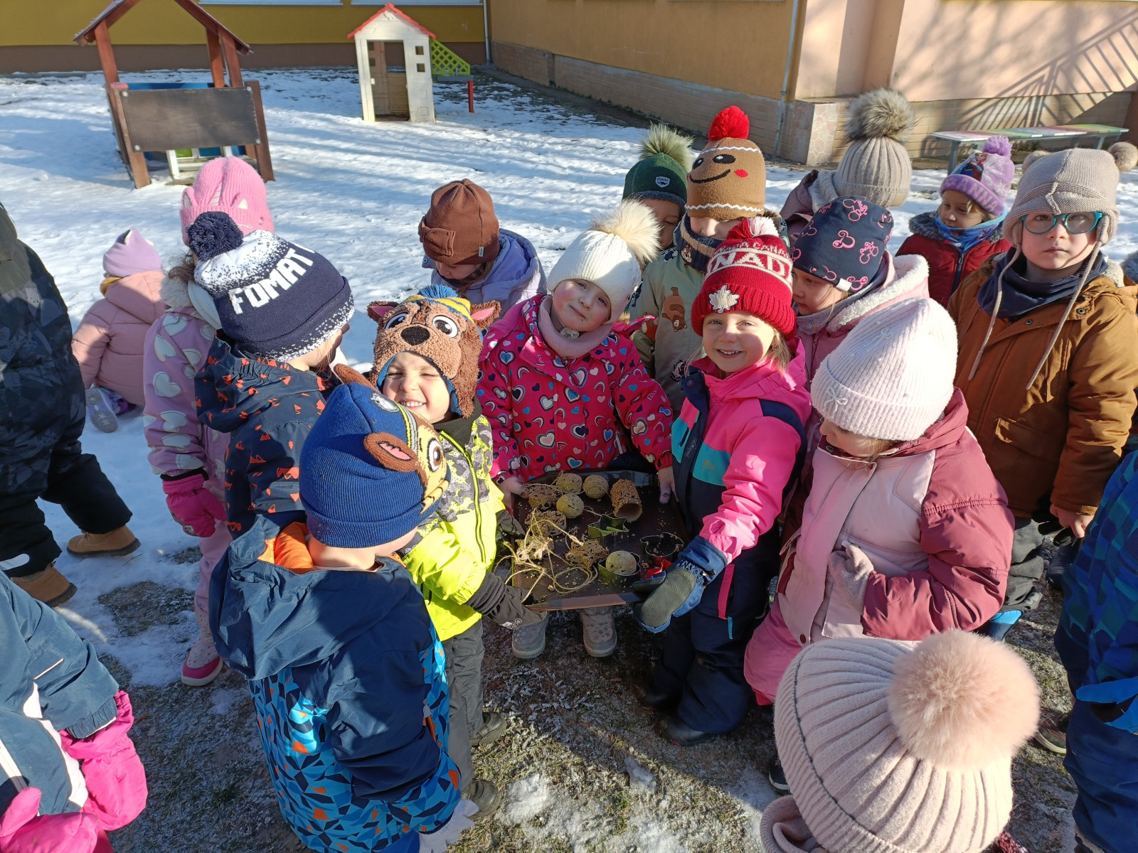 Zima nám ukazuje svoju silu mrazivým počasím. V zime najviac trpia voľne žijúce zvieratká, preto sme vyrobili pre vtáčiky potravu a tešíme sa, ako ich budeme pozorovať, keď si na nej budú pochutnávať.